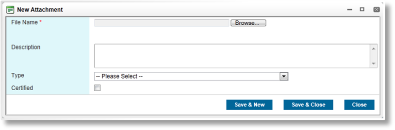 Click Save & New to attach the file and clear the form to attach another file, click Save & Close to attach the file and close the attachment window, or click Close to close the attachment window without attaching the file.