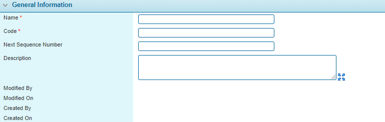 - On viewing or creating a configuration, the Sequence Number window opens. The panels and fields are described below. Fields marked with a red asterisk * are required.