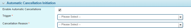 The Automatic Cancellation Initiation panel is used to configure the automatic cancellation of policies.  This only begins the cancellation process, requiring user-intervention or Automatic Cancellation Finalization settings to complete the process.