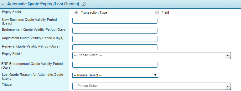 Available when Transaction Type is selected as the Expiry Basis.  Enter the number of days a quote for New Business remains valid.