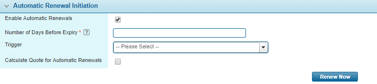 The Automatic Renewal Initiation panel is used to configure the automatic renewal of policy terms that are about to expire.  This only begins the renewal process, requiring user-intervention to complete the process.