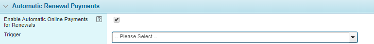 Trigger This field is displayed when the Enable Automatic Online Payments for Quoted Renewals checkbox is checked. Optionally select a trigger to control whether an automatic online payment request is initiated for eligible transactions. Enter at least three characters to search for triggers.
