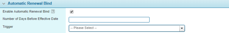 Trigger Optionally select a trigger to control whether renewal transactions are automatically bound for eligible terms. Enter at least three characters to search for triggers.