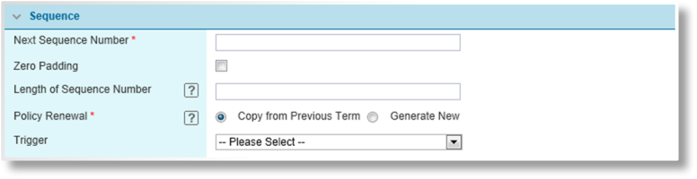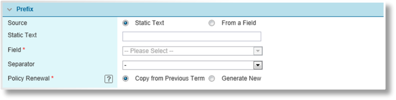 Caution: Older policies may have the full policy number saved as a single value, and not divided as Prefix, Sequence, and Suffix. This will not be an issue for renewals if all three settings are set to Generate New. However, if mixing Policy Renewal settings between Copy from Previous Term and Generate New, the system will not be able to divide the old policy number into the three components. In these instances, the policy numbers must be upgraded. Please contact your Insurity representative for more information on upgrading existing data.