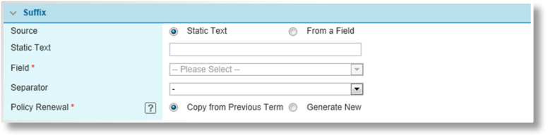 The Suffix panel is available when Automatic is selected as the Source. The Suffix ends every policy number under this master cover.