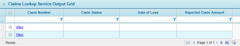 This is a Claims Lookup output grid configured to display four columns of claim records. For each record returned by the Claims Lookup, a row will be added to the grid containing the returned values for each claim. The number of results returned is limited to 1000.