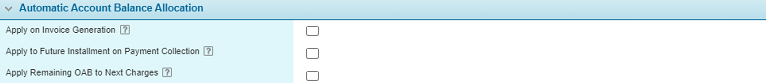 The Automatic Account Balance Allocation panel includes the setting to enable the automatic allocation of On Account Balance amounts to generated invoices. It also contains the setting to enable the automatic allocation of overpayments to future billing installments.