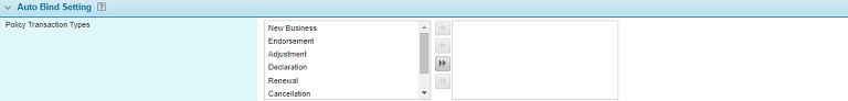 The Auto Bind Setting panel includes a field where a user may set the transaction types for the automatic binding of the policies after a payment is received.