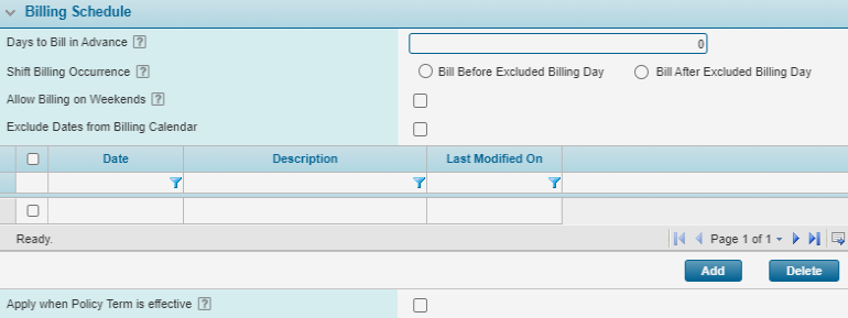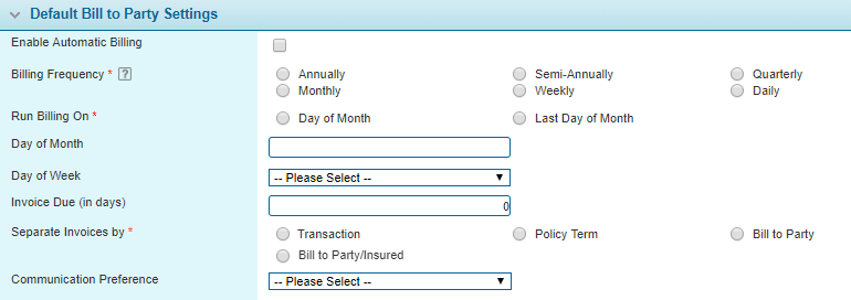 Note: The billing settings specified here can be modified for specific bill to parties at the Bill to Party configuration level.