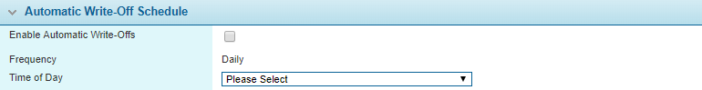 This field is displayed when Enable Automatic Write-Offs is checked. Select the time of day when the rules will be evaluated.