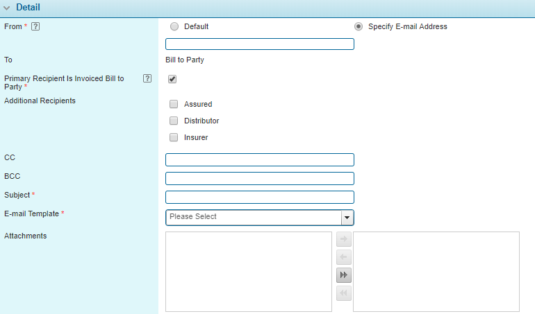 Note: When an invoice has multiple Distributors or Insurers, e-mails are not sent. Similarly, when an invoice contains charges from multiple policy terms, e-mails are not sent. |