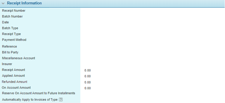 The Receipt Information panel lists the details of the receipt.  Clicking the Batch Number link opens the receipt batch details in a new tab or window, depending on your browser settings.